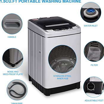 【Compact Washer& Large Load Capacity】The portable washing machine comes in space-saving sizes on 20.2*21*33.8 inches. But the 1.5cu.ft top load washer can hold 11lbs at one time and serves your all family. 2 handles are easy to move. Suitable for dorms, apartments, condos, RVs, camping, etc